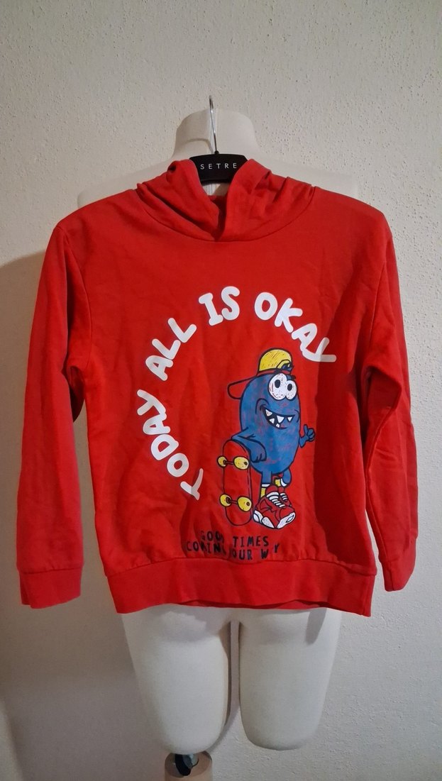 Kırmızı kapüşonlu, uzun kollu ve bol kesim erkek çocuk sweatshirtü. Renkli baskılı, düğmeli ve yumuşak, sıcak dokulu kumaştan yapılmıştır. Baskıda 'Today All Is Okay' yazısı ve kaykaylı karakter bulunur.