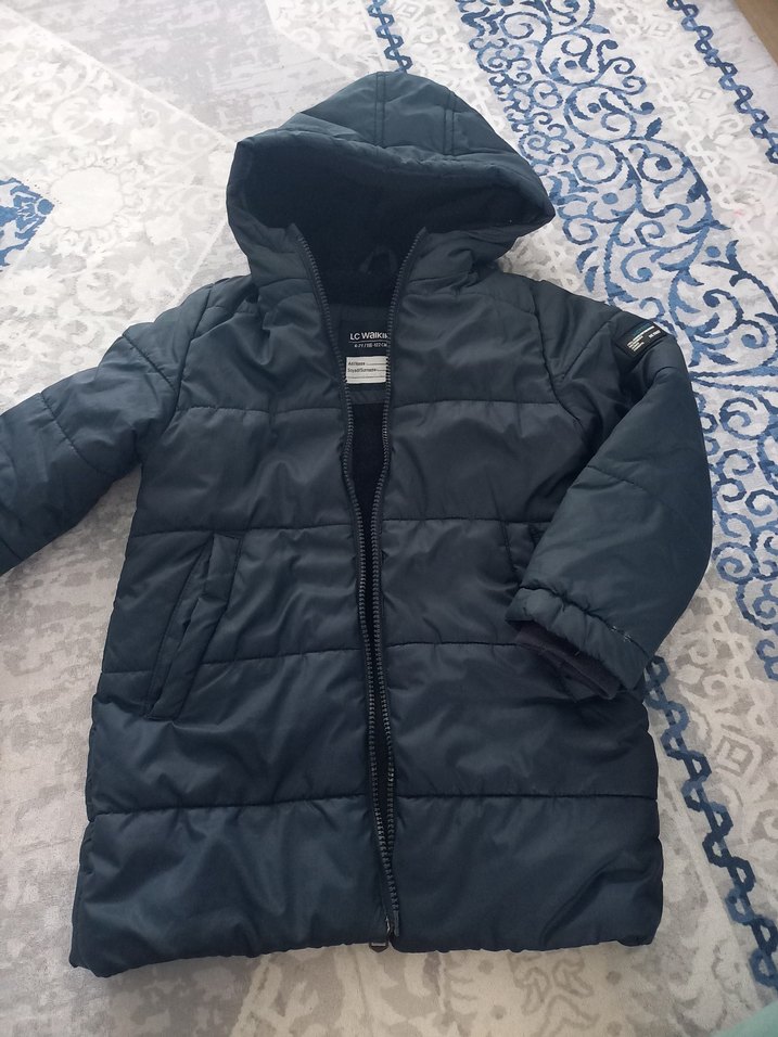 Kapüşonlu, kürklü detaylı, koyu gri renkli, desen içermeyen, fitted kesim erkek çocuk montu. Sıcak tutan yumuşak kumaştan yapılmıştır.