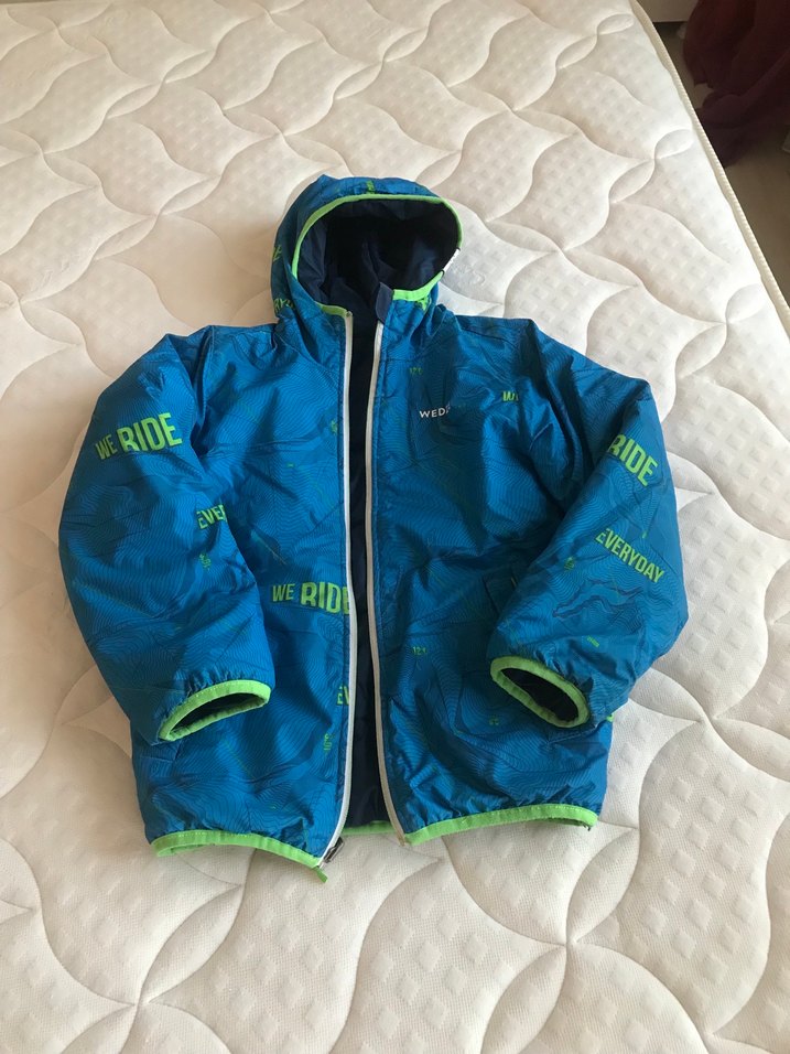 Dechatlon marka Kapüşonlu, fermuarlı ve renkli baskılı desenli, su itici yumuşak ve sıcak kumaştan yapılmış erkek çocuk için bol kesim mont. Sokak stili için uygun.