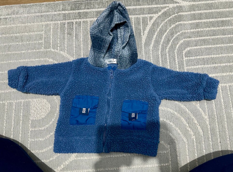 Kapüşonlu, gri triko detaylı, iki cepli mavi erkek çocuk mont. Yumuşak ve sıcak kumaştan, sade ve rahat bir sokak stili sunar.