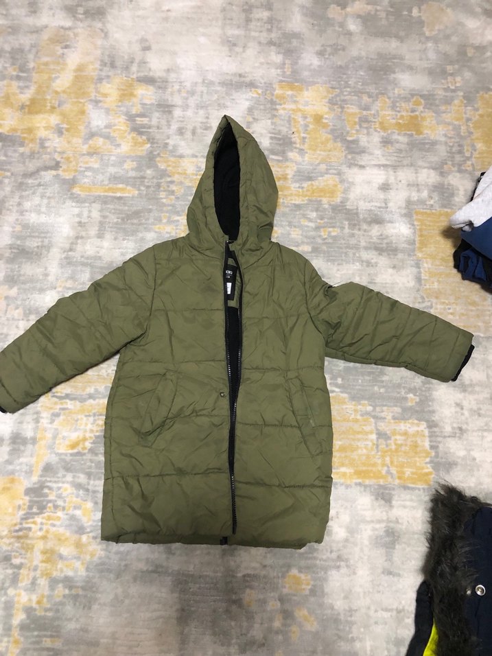 Koyu yeşil renkte, kapüşonlu ve fermuarlı, soft ve sıcak kumaştan erkek çocuk kabanı. Rahat sokak giyimi için uygun. Minik bir deliği var elle bile dikilir