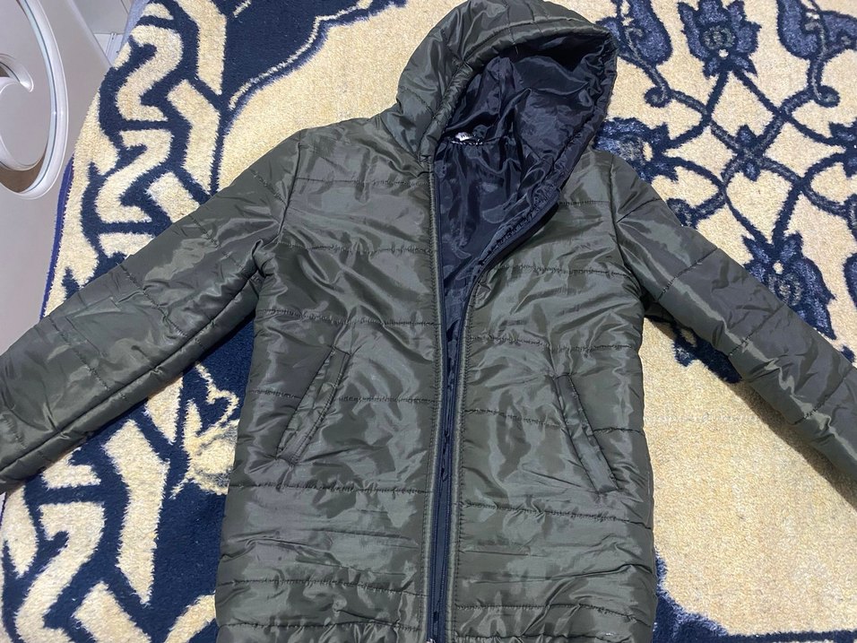 Gri renkli, kapüşonlu ve fermuarlı erkek çocuk mont. İnce sentetik kumaştan, uzun kollu ve normal boyda, sokak stiline uygun. İç astar koltuk altı kısmında sökük var dikilebilir baska bir problemi yok 11 12 yas cocuk icin uygun bedeni