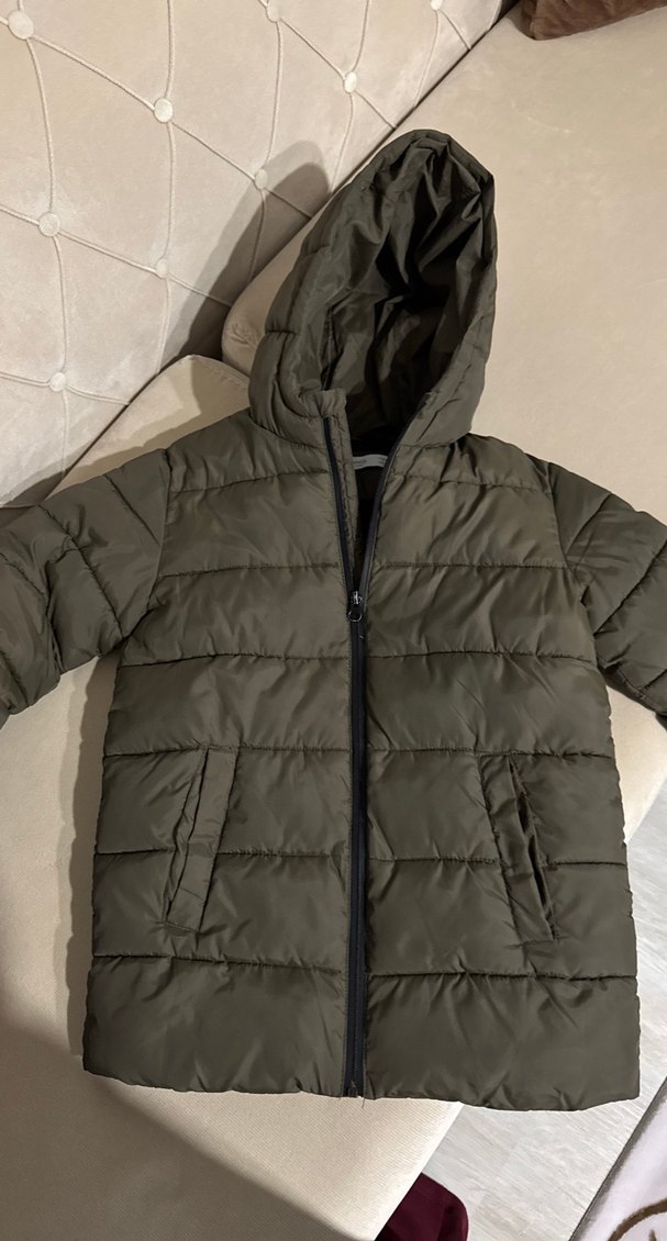 Fermuarlı ve kapüşonlu, haki yeşil renkte, su geçirmez sıcak kumaştan erkek çocuk montu. Sokak stiline uygun sade tasarım.