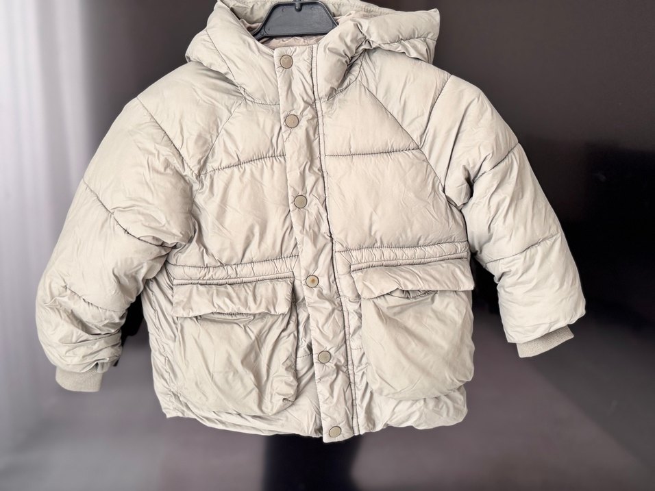 Bol kesim, düğmeli ve büyük cepli bej erkek çocuk mont, yumuşak ve rahat kumaştan. Sokak stili için uygun. Su itici özelliği vardır