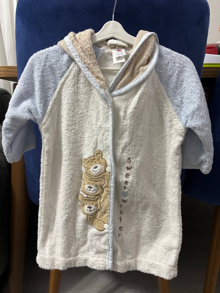 Kapüşonlu ve nakışlı ayıcık detaylı, pastel tonlarda yumuşak ve emici kumaştan erkek çocuk bornozu.