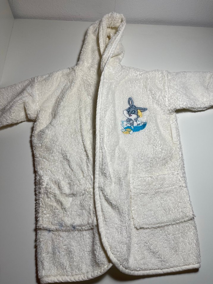 Sevimli Bugs Bunny işlemeli, beyaz renkli, yumuşacık bebek bornozu. Pamuksu havlu dokusu sayesinde banyo sonrası bebeğinizi nazikçe kurular. Kapşonlu tasarımı ile başı sıcak tutar. Bel kısmında kuşaklı, iki cepli modeldir. Yumuşak, emici havlu kumaştan üretilmiştir. Ürünün genel durumu iyi, sadece alt kısmında çok hafif mavi tonlu deterjan izi mevcuttur (fotoğraflarda görülebilir). Beden: Yaklaşık 1,5–3 yaş arası uygundur Renk: Beyaz Durum: Temiz, yumuşak dokusu korunmuş Detay: Kapşonlu, kuşaklı, cep detaylı Etiketler: #BebekBornozu #BanyoSonrası #KapşonluBornoz #BugsBunny #UnisexBebek #HavluBornoz
