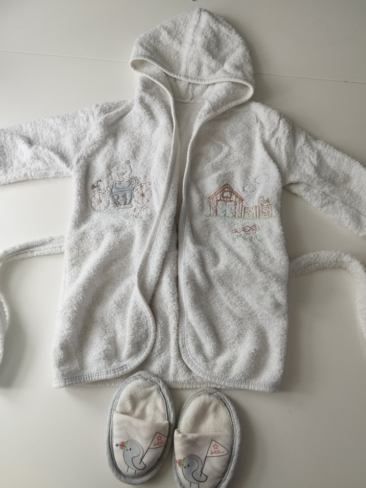 Kapüşonlu beyaz erkek çocuk bornozu, gri nakış detaylı ve uyumlu terliklerle birlikte. Yumuşak ve rahat kumaş, banyo sonrası konfor sağlar.