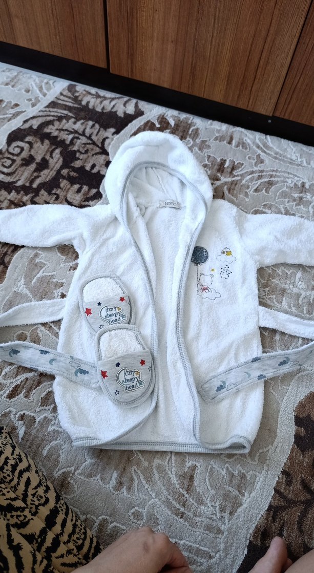 Nakışlı detaylara sahip beyaz kapüşonlu erkek çocuk bornozu ve uyumlu terlikler. Banyodan sonra rahatlık için yumuşak ve konforlu kumaş.