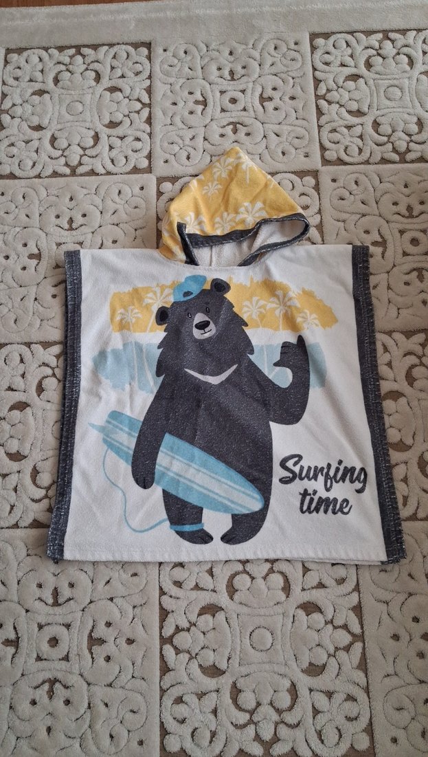 Gri kapüşonlu erkek çocuk plaj havlusu, üzerinde sörf yapan ayı ve 'Surfing time' yazısı baskılıdır. Yumuşak dokulu ve eğlenceli tasarımlıdır.