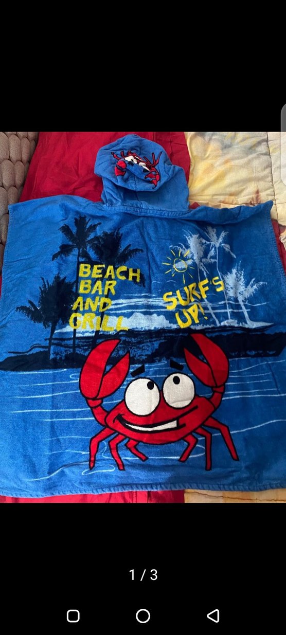 Kapüşonlu, renkli baskılı kırmızı yengeç figürlü mavi erkek çocuk plaj havlusu. Yumuşak ve emici kumaştan yapılmıştır.