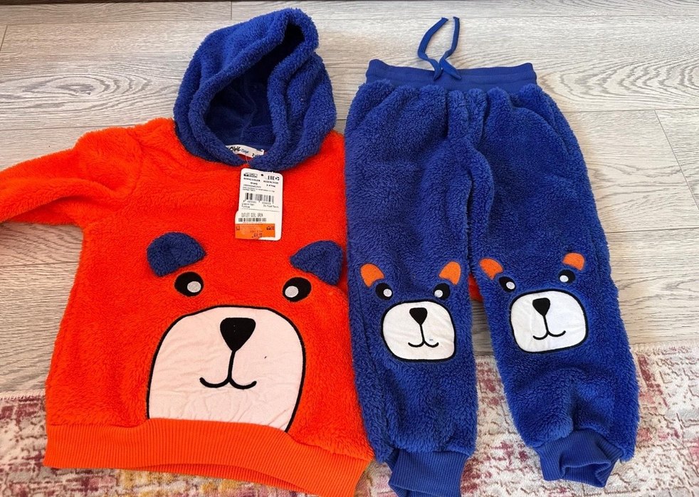 Kapüşonlu, renkli ayı yüzü baskılı üst ve ayı desenli mavi pantolonlu erkek çocuk takımı. Yumuşak ve sıcak kumaş rahatlık sağlar.