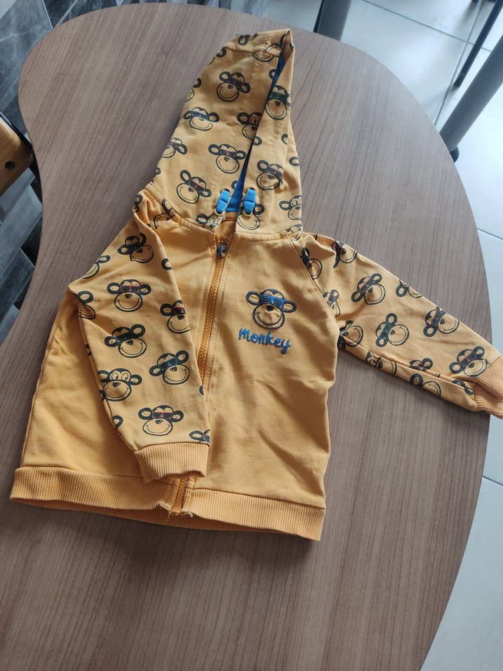 Yumuşak ve sıcak kumaştan yapılmış, kapüşonlu ve fermuarlı sarı erkek çocuk sweatshirtü. Renkli maymun baskılı, uzun kollu ve dar kesimdir.