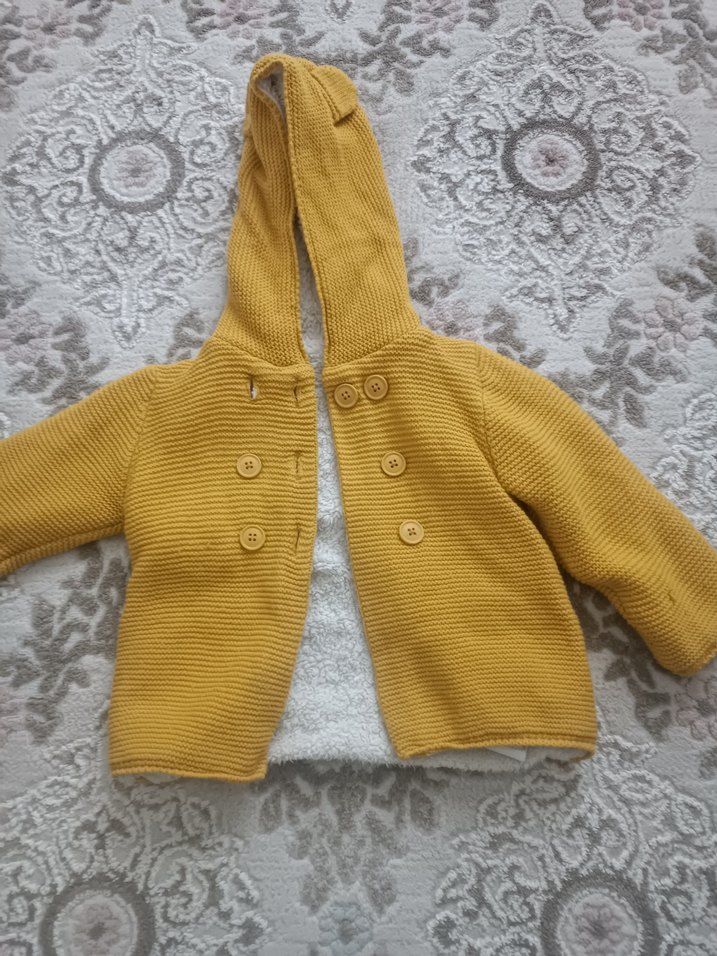 Sarı renkli, kapüşonlu erkek çocuk hırkası, yumuşak örgü kumaştan ve bol kesimdedir. Düz ve düğmeli tasarıma sahiptir.