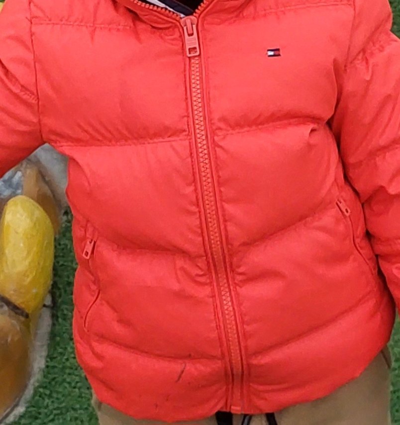 Orjinal Kapüşonlu, şişme erkek çocuk montu, yumuşak ve sıcak kumaştan kaz tüyü mont Düz renk nar çiçeği, sadece bir yerinde leke var kullanıma engel değil