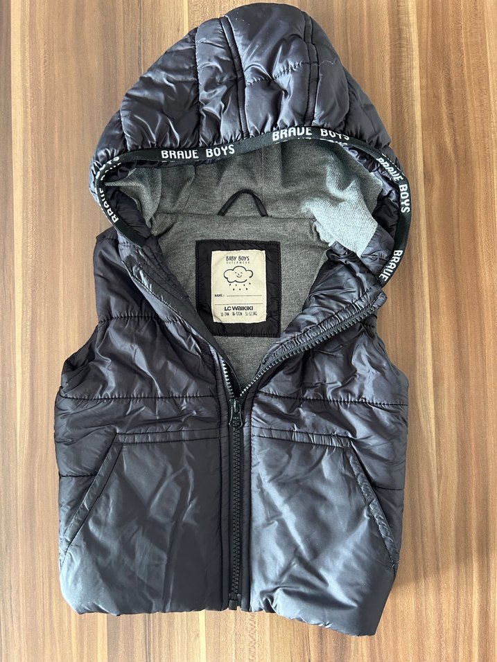 Siyah renkli, kapüşonlu erkek çocuk yeleği. Oldukça iyi durumda , hafif bir yelektir. 18-24 ay 86-92 cm 11-12.5 kg için uygundur.