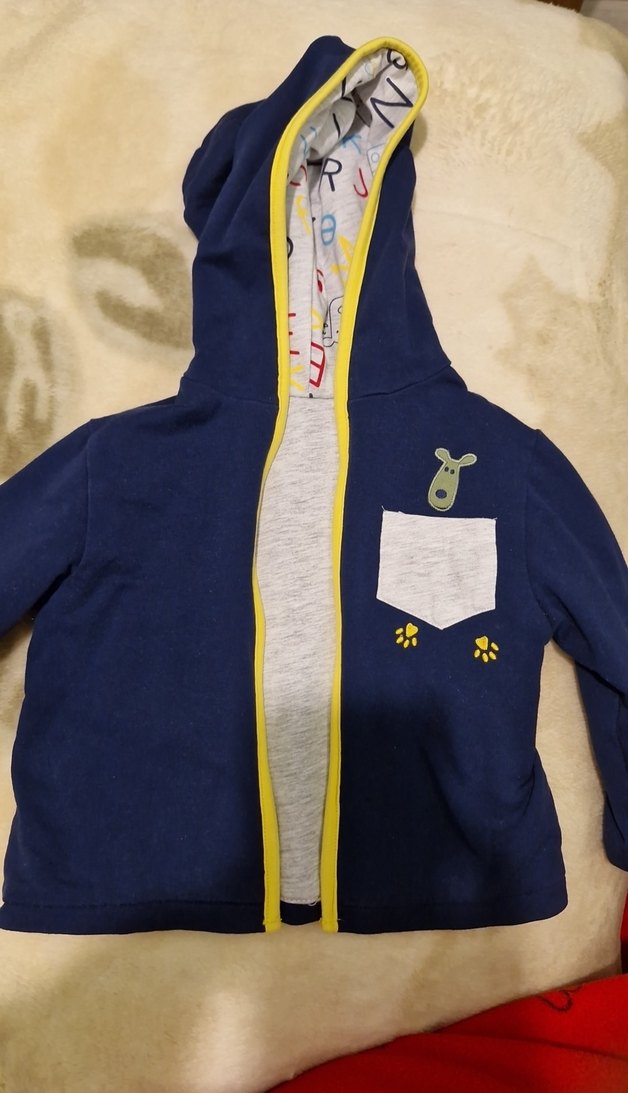 Düğme ve ya fermuar yok Mavi ve gri renklerde kapüşonlu, erkek çocuk sweatshirtü. Uzun kollu, dar kesim ve yumuşak, sıcak kumaştan. Baskılı cep ve pati detayları içerir.