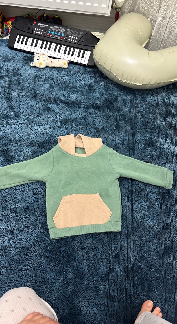 Uzun kollu, kapüşonlu erkek çocuk sweatshirti, yumuşak ve sıcak dokuda, bol kesim. Pastel yeşil renk, bej ön cep ve kapüşon astarıyla sade, streetwear tarzında.