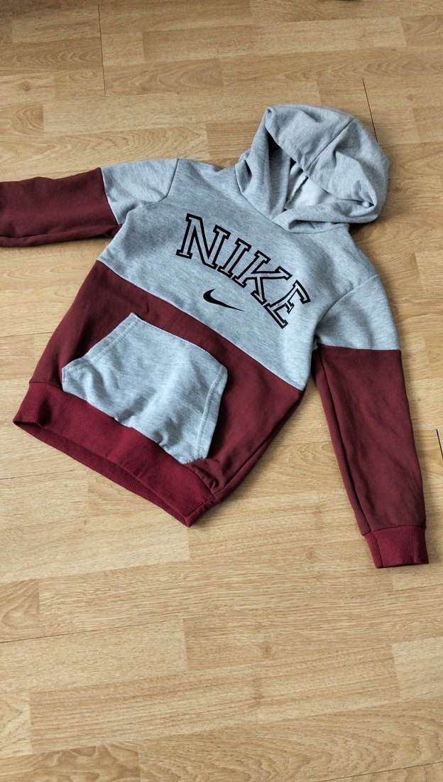 Gri ve bordo renk bloklu, uzun kollu ve yuvarlak yakalı erkek çocuk sweatshirtü. Yumuşak ve örgü dokulu kumaştan, NIKE baskılı. Rahat ve bol kesim sokak stili için uygundur.