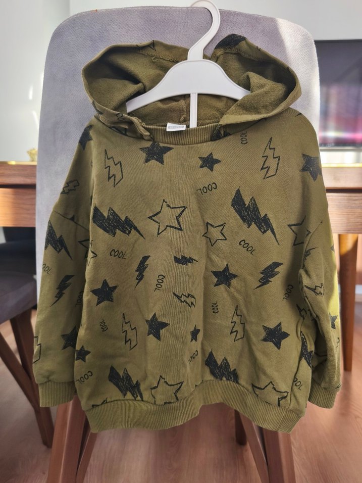 Kapüşonlu, uzun kollu ve bol kesim olan bu erkek çocuk sweatshirtü, yumuşak ve sıcak kumaştan yapılmıştır. Koyu Haki renkte, yıldız ve şimşek baskılıdır.