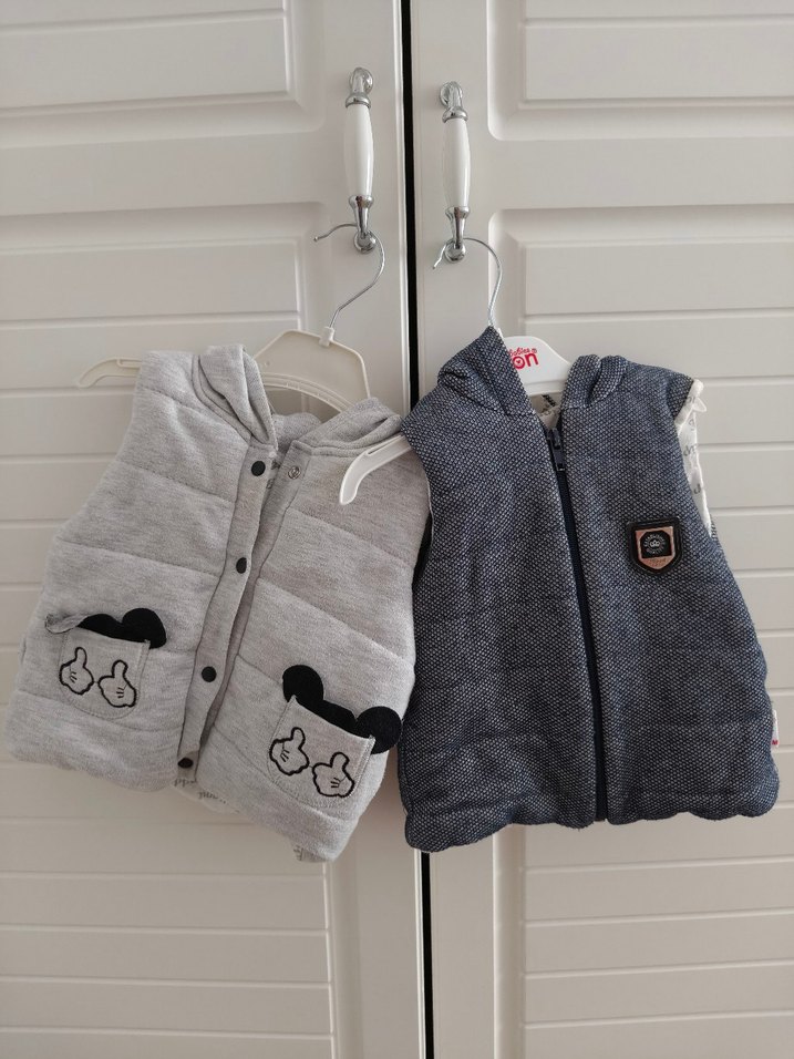 Kapüşonlu, nakışlı ve triko detaylı erkek çocuk yeleği, gri tonlarında ve sıcak tutan yumuşak kumaştan yapılmıştır.