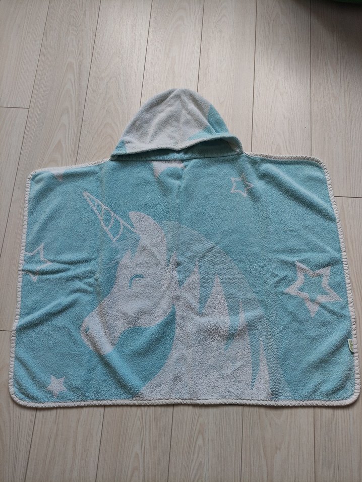Kapüşonlu, turkuaz renkli erkek çocuk bornozunda unicorn ve yıldız desenleri bulunur. Yumuşak ve emici kumaştan üretilmiştir.