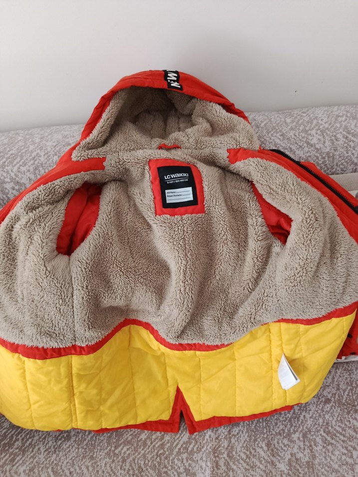 Kapüşonlu, turuncu renkli erkek çocuk kabanı, yumuşak kürk detaylı iç astarıyla sıcak tutar. daha 1 sene bile giyilmedi