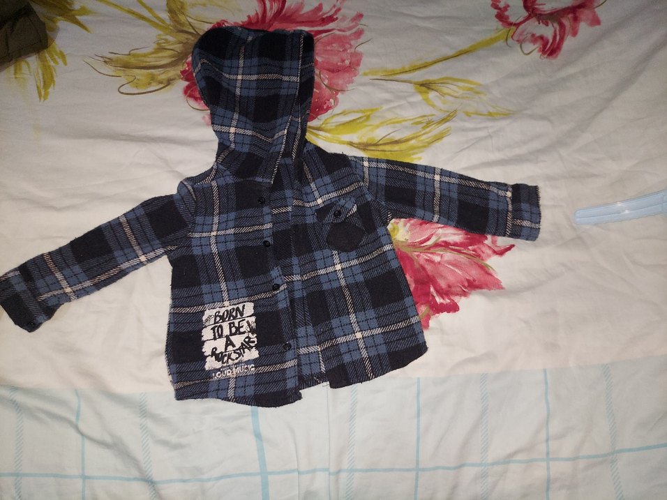 Kapüşonlu, uzun kollu ve düğmeli erkek çocuk gömleği. Yumuşak ve sıcak kumaştan, koyu mavi ekose desende ve 'BORN TO BE' yazılı yama detaylıdır.
