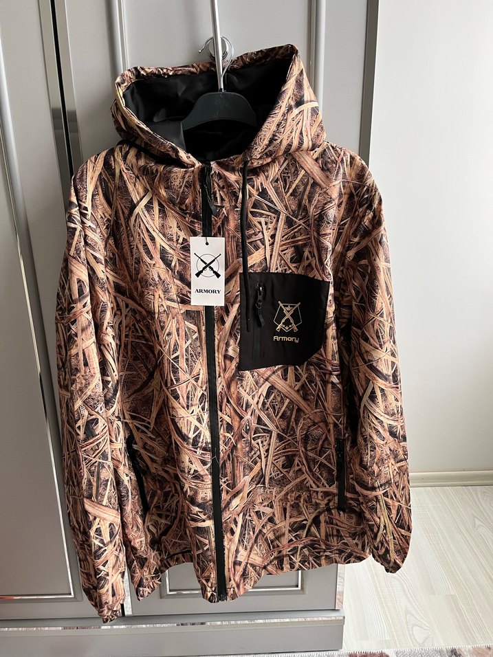 Kapüşonlu, fermuarlı, baskılı kahverengi erkek rüzgarlık. Uzun kollu ve bol kesimdir, dış mekanlar için uygundur.