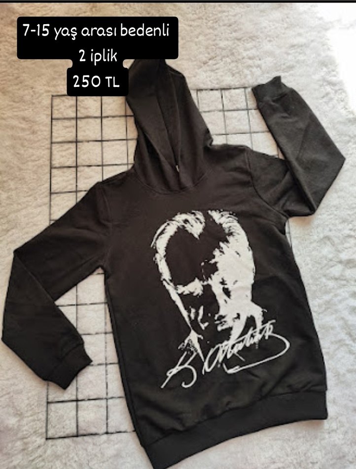7-15 yaş arası bedenli, baskılı siyah kapüşonlu sweatshirt. Uzun kollu, fermuarlı ve yumuşak sıcak kumaştan üretilmiştir. Fiyat: 250TL.