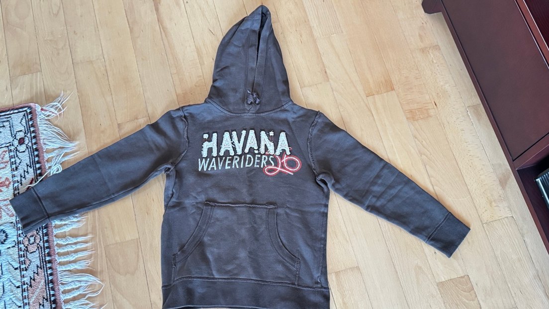 Uzun kollu, kapüşonlu erkek sweatshirtü yumuşak ve sıcak kumaştan yapılmıştır. 'HAVANA WAVERIDERS' baskısı ve cırt cırt detayı vardır. Koyu gri renk, rahat ve şık bir görünüm sunar.