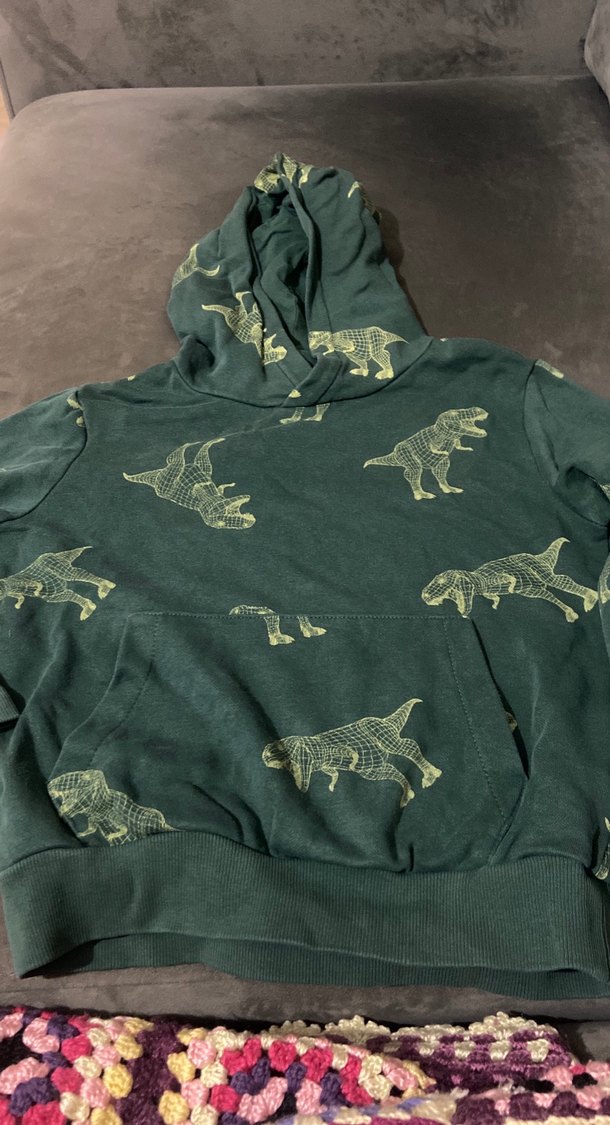 Koyu gri kapüşonlu, uzun kollu erkek sweatshirt, baskılı dinazor desenleri ve fermuarlı cep detayına sahip, rahat kesim.