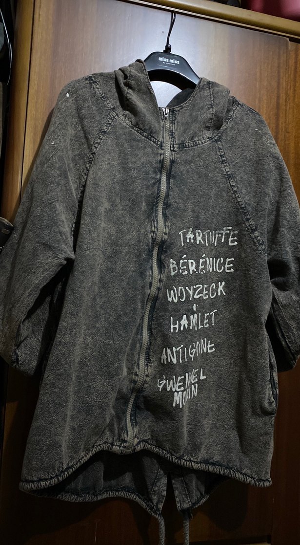 Baskılı 2 cepli,kapüşonlu ve ferm.kolları apoletli denim ceket. Baskılı yazılarla süslenmiş, bol kesim ve midi boy, uzun kollu, grunge punk tarzında günlük kullanıma uygun.