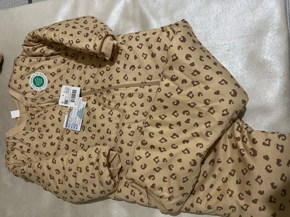 Kahverengi, midi boy baskılı uyku tulumu kapüşonlu yakaya ve fermuarlı kapanışa sahiptir. Uzun kollu, vücuda oturan kesimiyle rahat ve şık