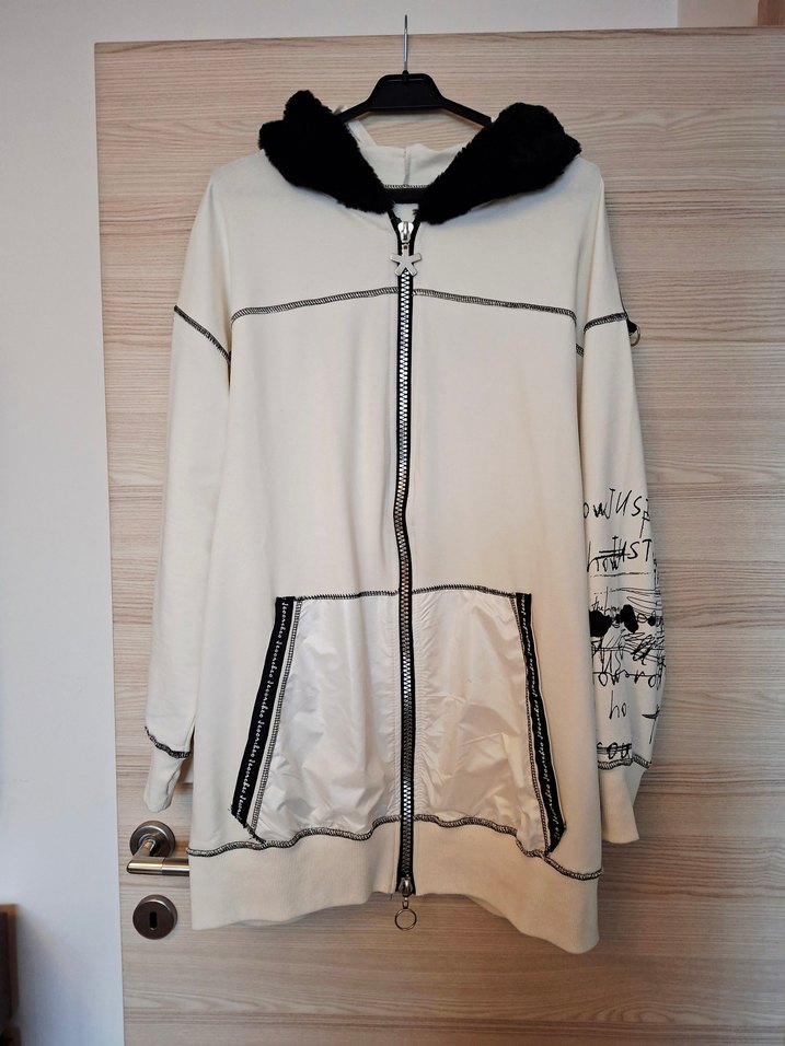 Uzun beyaz ceket, siyah yumuşak astarlı kapüşon, fermuarlı ön, baskılı kol detaylarına sahiptir. Gri kontrastlı, bol kesim ve ön cepler bulunur. Hiç giyilmemiştir.