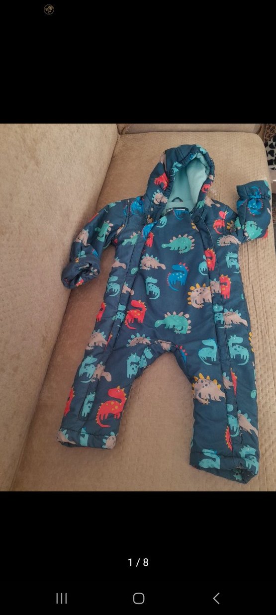 Kapüşonlu ve fermuarlı, yumuşak ve sıcak dokulu koyu mavi bebek tulumu. Renkli dinozor desenleri ve sokak giyimi tarzında tasarlanmıştır. Herhangi bir defo yıpranma vs.yoktur.