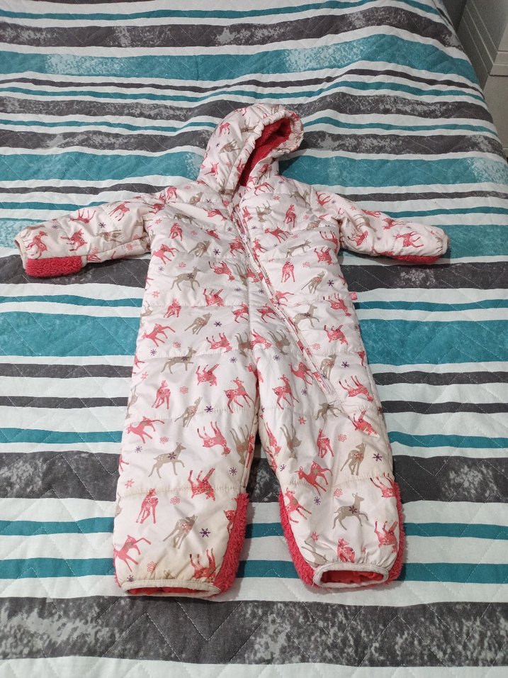 Kapüşonlu ve fermuarlı bebek kız tulumu ürünün bilek kısımlarında hafif sararma vardır ama kullanımına hiç engel değildir sağlamdır iyi durumdadır ama bir sıfır ürün değildir konşonu ve beline kadar içi polardır güzel bir üründür 74/80 cm 6 ve 9 aylıktır