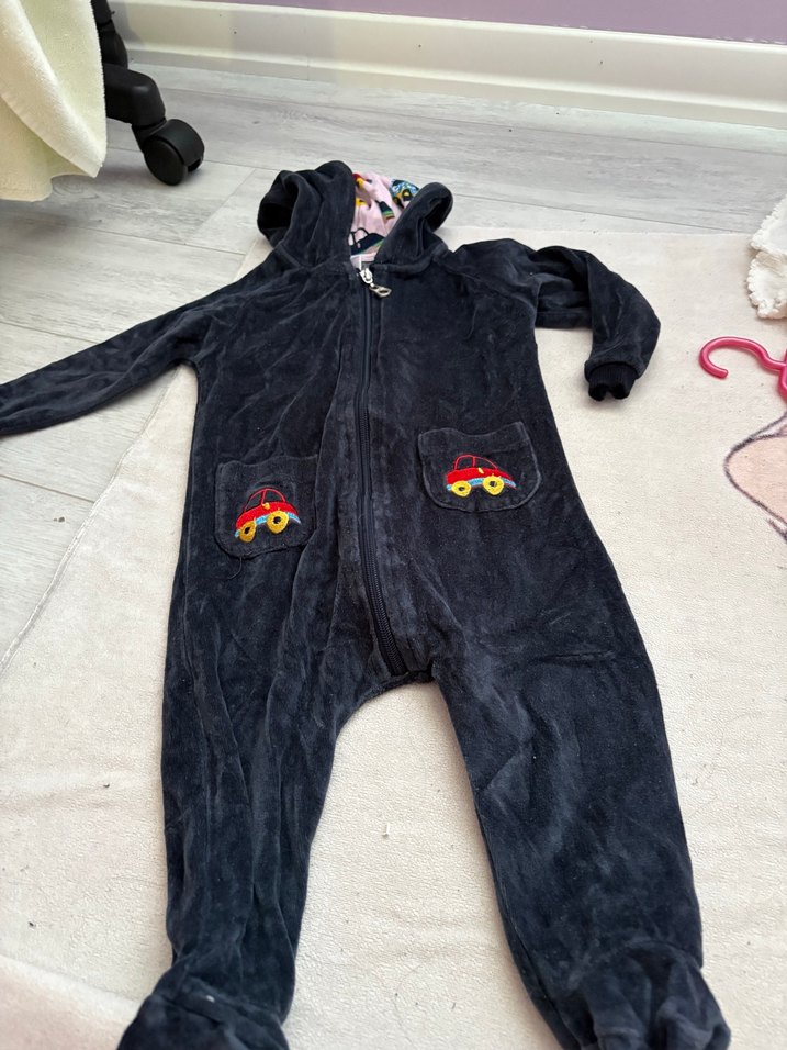 Kapüşonlu ve fermuarlı koyu gri bebek tulumu, yumuşak ve sıcak kumaştan üretilmiştir. Uzun kollu ve ceplerinde araba desenleri vardır.