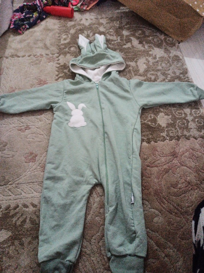 Yumuşak ve sıcak kumaşlı, ön fermuarlı, kapüşonunda tavşan kulakları olan bebek tulumu. Pastel gri renkte, göğsünde tavşan detayı bulunur.