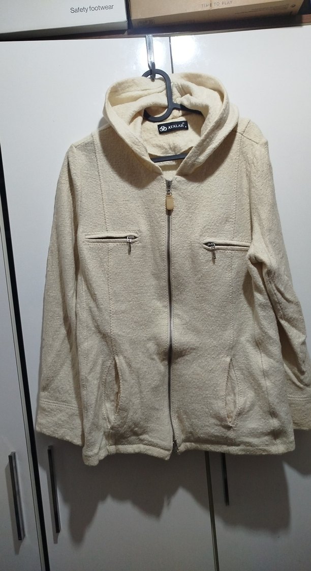 Yumuşak ve sıcak kumaştan yapılmış, kapüşonlu ve fermuarlı bej ceket, bol kesimi ve cepleriyle rahat sokak stili için uygundur. yün sadece kuru temizleme krem rengi s_m uyumlu