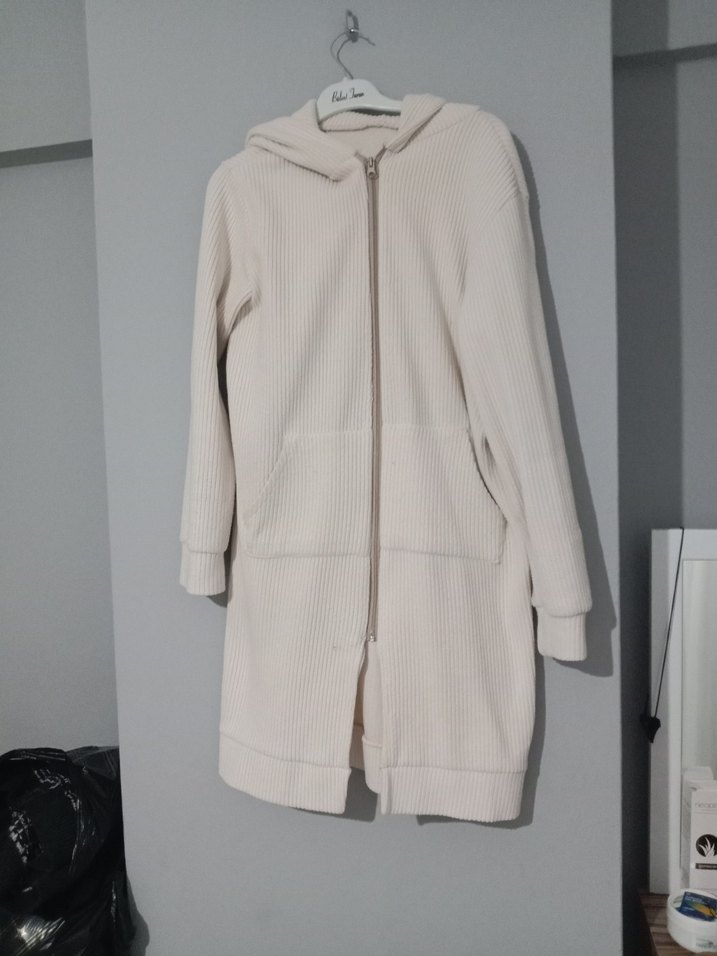 Yumuşak kumaştan, kapüşonlu ve fermuarlı uzun beyaz kadın hirka, bol ve rahat kesimiyle günlük kullanıma uygundur.