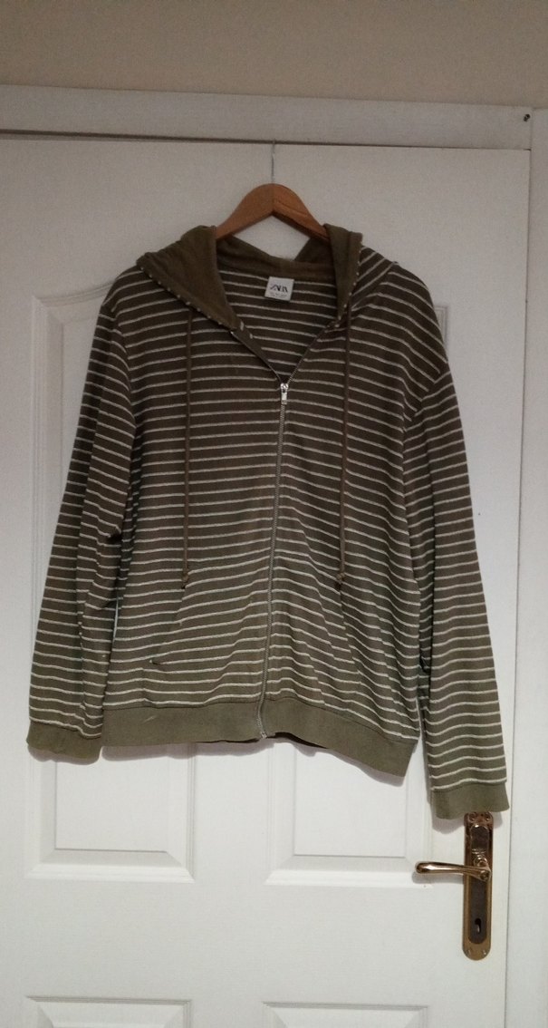 Uzun kollu, fermuarlı ve kapüşonlu, bej ve gri tonlarda çizgili sweatshirt. Yumuşak ve sıcak kumaştan, rahat kullanım için uygun.