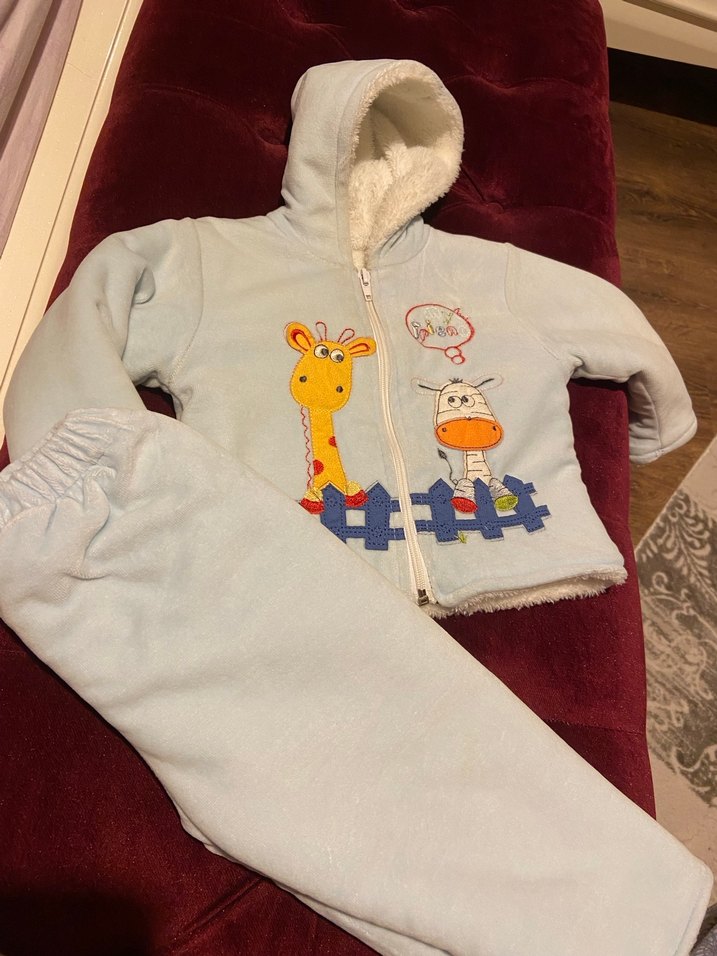 Renkli baskılı, kapüşonlu ve fermuarlı uzun kollu üst ile yumuşak ve sıcak kumaştan erkek bebek takımı. Rahatlık ve tarz için uyumlu pantolon içerir.