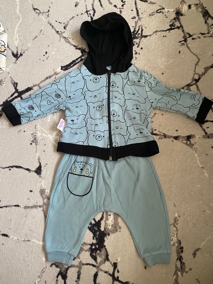 Kapüşonlu, fermuarlı ve uzun kollu ceket ile yumuşak ve sıcak kumaştan yapılmış erkek bebek takımı. Ayıcık desenli ceket, küçük cepli sade pantolonla tamamlanmıştır. 3-6 ay ama likralı olduğu için 1 yaşında bile rahat olur