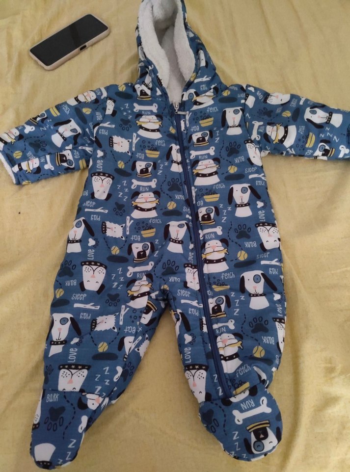 Mavi ve gri renklerde, fermuarlı ve baskılı desenli erkek bebek tulumu. Yumuşak ve sıcak tutan kumaştan üretilmiştir. ❄️