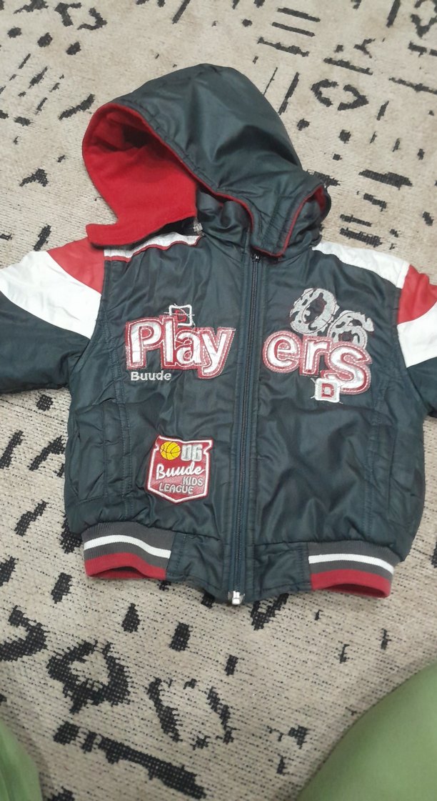 Kapüşonlu ve fermuarlı, biker tarzı erkek çocuk montudur. Yumuşak ve sıcak kumaştan, koyu gri renkte, kırmızı ve beyaz detaylı baskılıdır.