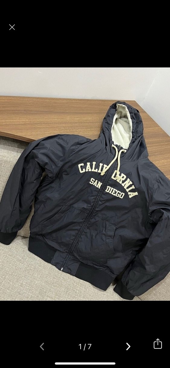 Koyu gri, kapüşonlu ve fermuarlı, baskılı "California San Diego" yazılı Yumuşak kumaştan, günlük sokak stili için uygun. 2 kez giyildi