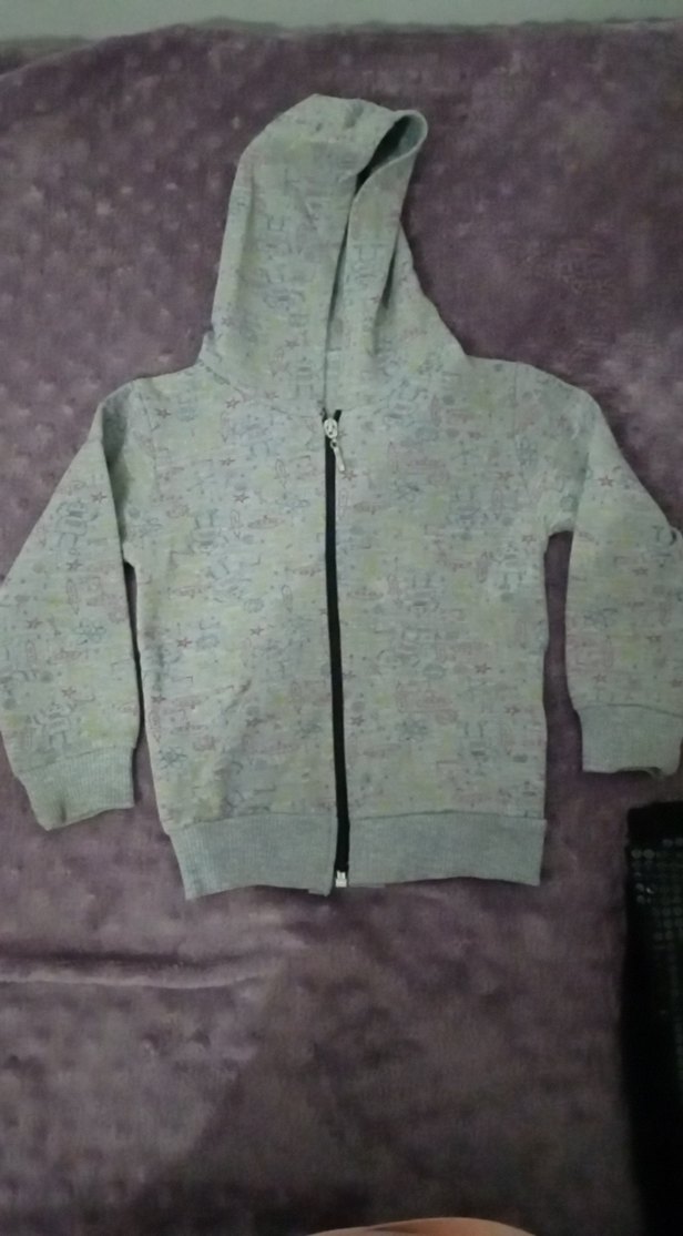 Gri renkli, kapüşonlu ve fermuarlı erkek çocuk sweatshirt. Uzun kollu, bol kesim ve baskılı detaylara sahip, yumuşak ve sıcak kumaştan üretilmiştir. bir defa tek giyinmiştir yepyeni 3yal yazıyor fakat 1buçuk 2yaş anca olur kalıbı dar