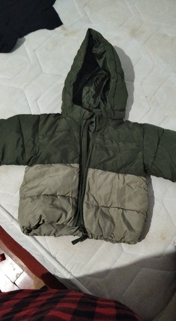 Kapüşonlu ve fermuarlı, gri ve yeşil renklerde, yumuşak ve sıcak dokulu erkek çocuk montu. Sokak stili için uygun, dar kesim.Boyu 34 cm Eni 30 cm