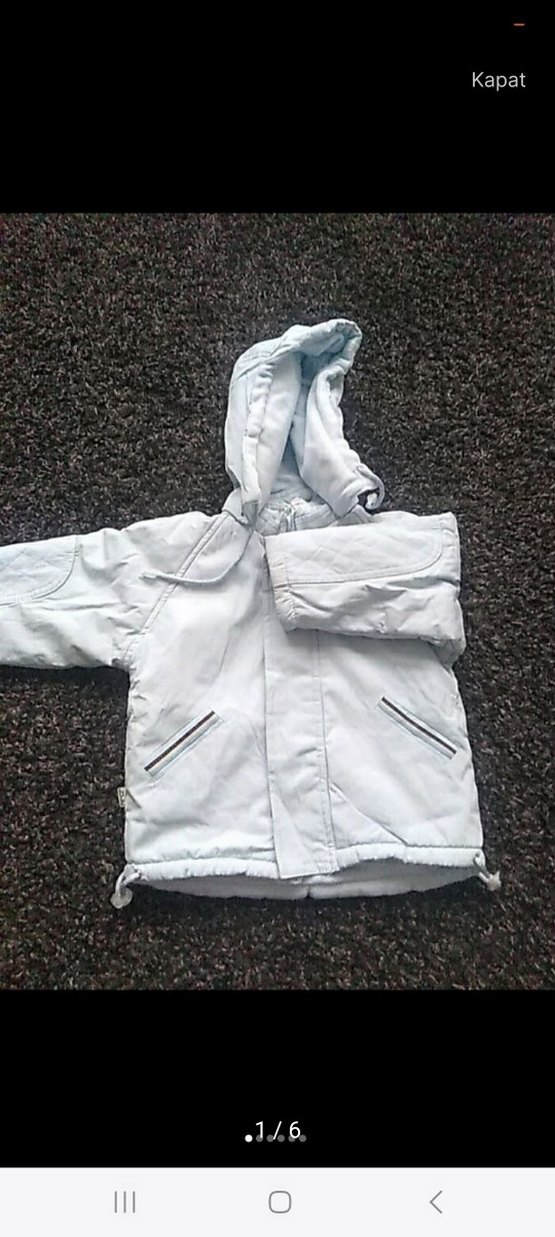 Kapüşonlu ve fermuarlı ceplere sahip, düz gri renkte, yumuşak ve sıcak kumaştan yapılmış, erkek çocuk için dar kesim mont. genel durumu çok iyi sadece kolunda ufak bir kesik var