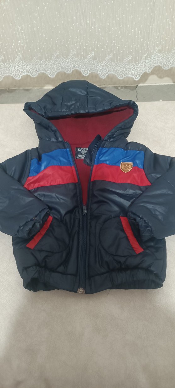 Fermuarlı ve kapüşonlu, rahat kesimli erkek çocuk montu. Koyu mavi, kırmızı ve mavi şeritlerle sokak stili için yumuşak ve sıcak kumaştan yapılmıştır.